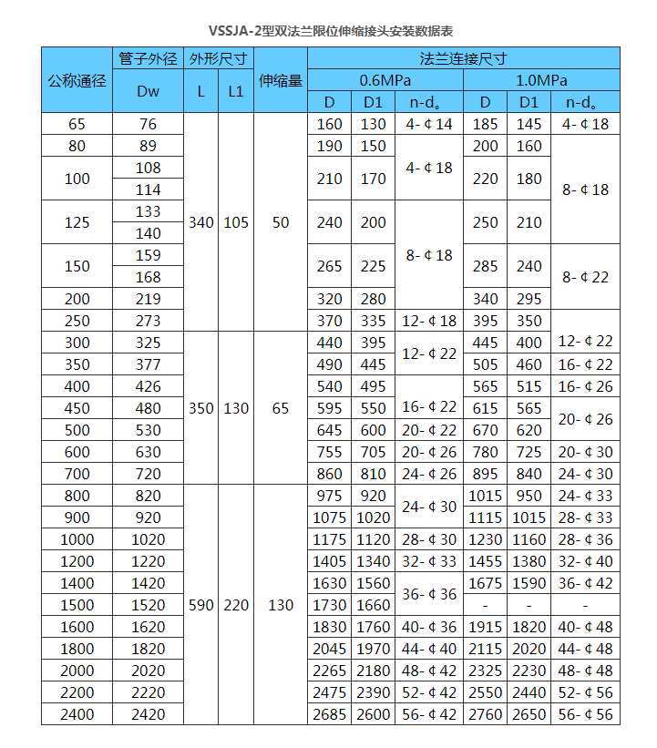 該產(chǎn)品伸縮量大、安裝方便快捷。適用于兩端法蘭連接的管道上面。VSSJA-2型雙法蘭限位伸縮接頭能夠?qū)崿F(xiàn)管道軸向位移的補償,并且能夠大大減少管道運行時的軸向推力,從而延長管道的使用壽命,保護線路的安全運行。并且安裝在管道線路上能夠方便閥門的拆裝與維護,并且能夠克服地陷對管道線路造成的不良影響。